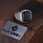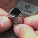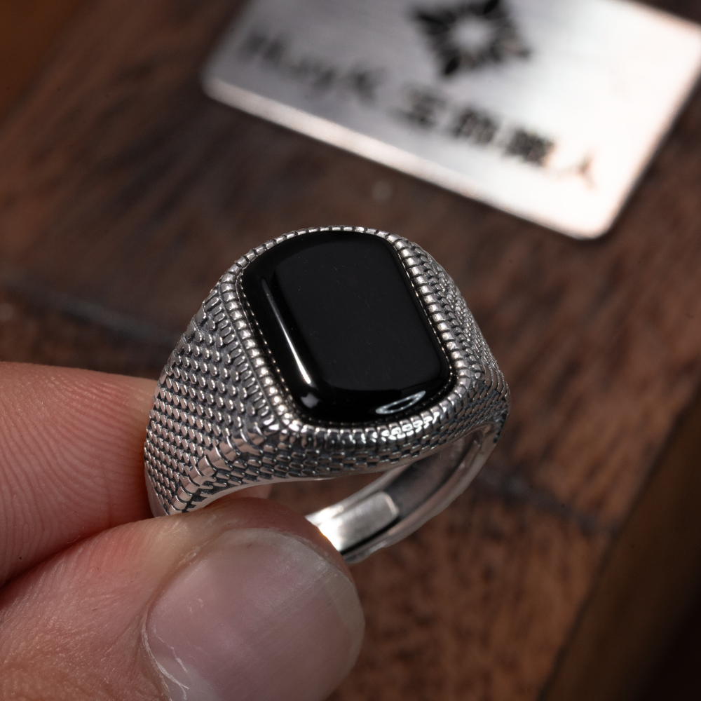 シンプルでありながら力強い印象を与えるデザインのブラックストーンリング