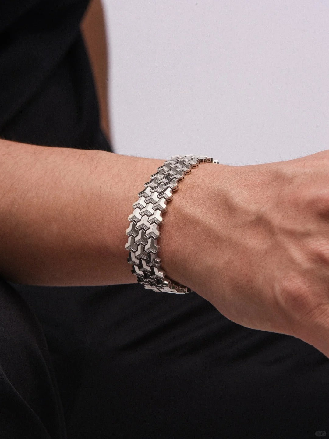 กำไลนี้ผลิตจากเงิน S925 คุณภาพสูง รับประกันความทนทานและความเงางามยาวนาน ดีไซน์อาร์เมอร์ 3 แถวให้ความรู้สึกแข็งแกร่ง มีเอกลักษณ์แต่ยังคงความเรียบหรู ลวดลายซ้ำเป็นระเบียบเพิ่มความมั่นคงและความหรูหรา