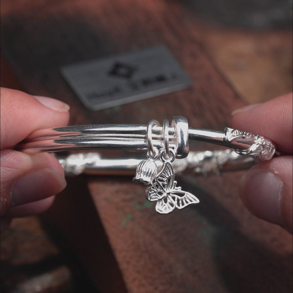 這是一款以花朵和葉子為主題設計,搭配可愛蝴蝶吊飾的純銀手鍊。
